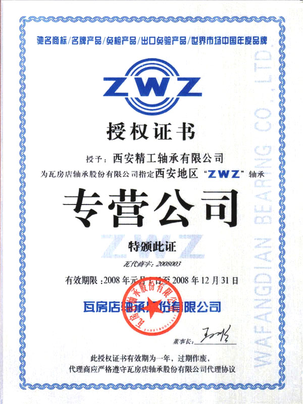 本公司是瓦房店轴承股份有限公司“ZWZ”产品,哈尔滨轴承股份有限公司“HRB”产品西北总代理,并配套经销国内其它知名品牌。2004年7月28日获德国FAG特约经销商代理资格,同时销售德国INA、瑞典SKF、日本NSK、NTN、KOYO、IKO等世界名优品牌轴承。