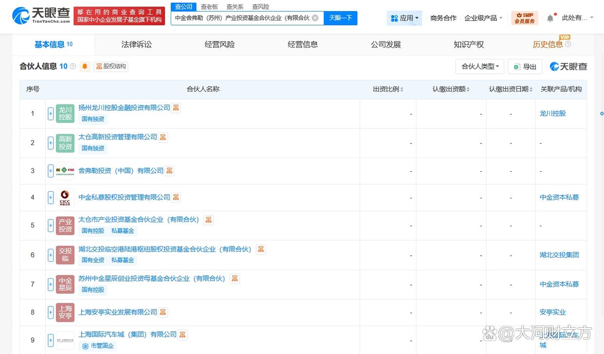 合伙人信息显示,该基金由扬州龙川控股金融投资有限公司、太仓高新投资管理有限公司、舍弗勒投资(中国)有限公司、中金私募股权投资管理有限公司等共同出资。