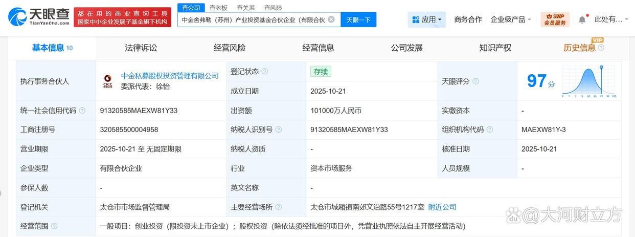 10月23日消息,天眼查工商信息显示,近日,中金舍弗勒(苏州)产业投资基金合伙企业(有限合伙)成立,执行事务合伙人为中金私募股权投资管理有限公司,出资额10.1亿人民币,经营范围为创业投资、股权投资。