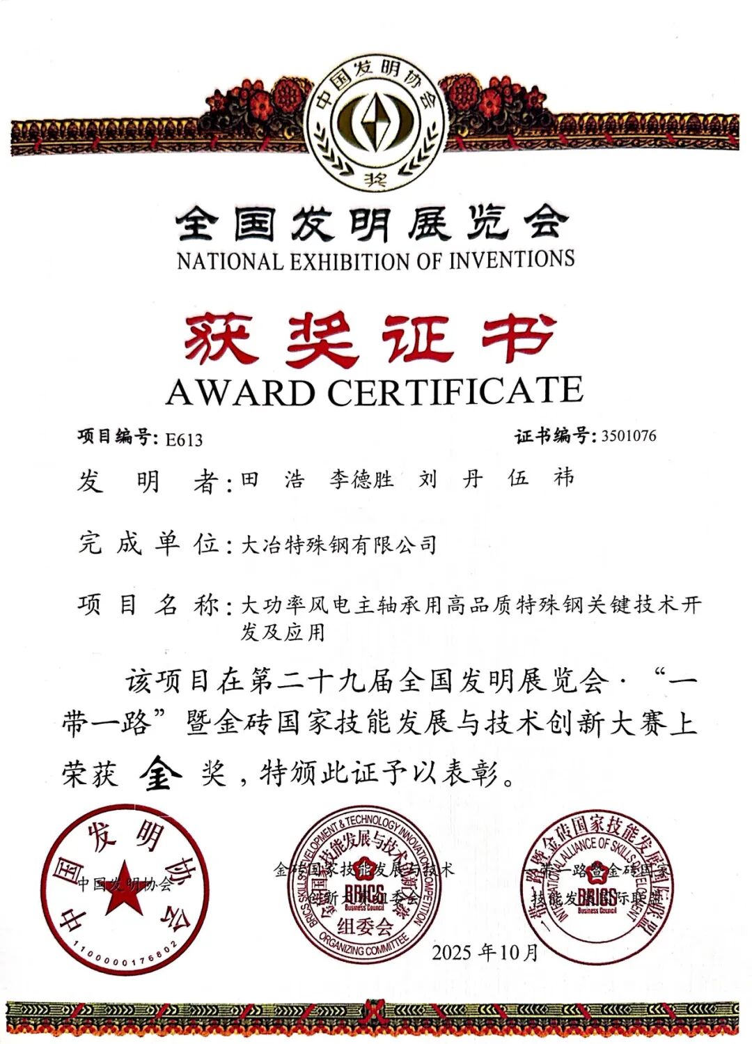 近日,由中国发明协会、中国科技促进会、中国信息协会、新华网(603888)共同举办的第二十九届全国发明展览会“一带一路”暨金砖国家技能发展与创新大赛在石家庄圆满落幕。大冶特殊钢有限公司“大功率风电主轴承用高品质特殊钢关键技术开发及应用”项目荣获金奖。