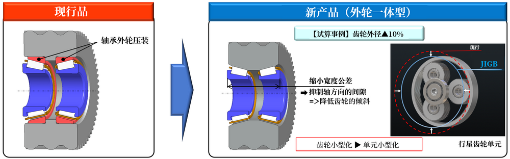 现行产品的齿轮轴是通过将轴承压入轴来实现的,由于轴径的限制,难以缩小轴承和减速机的尺寸,并且在降低扭矩损失方面存在课题。对此,此次研发的新产品通过在齿轮轴外径上添加轴承轨道,使其与轴承一体化。由此,省去了轴承的内圈(轨道轮),从而实现了轴承外径和单元(轴间距)的小型化以及扭矩损失的降低。通过省去了轴承的压入工序,为客户生产效率的提高做出了贡献。