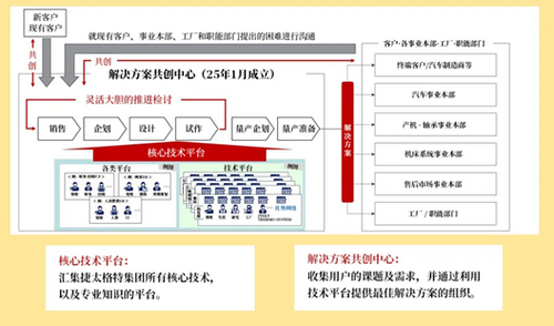 捷太格特提出了2030集团愿景,旨在“通过产品制造和制造产品的设备,成为移动社会的综合解决方案供应商,共同缔造未来移动社会”。同时捷太格特集团成立了集结所有集团核心技术及专业知识的“核心技术平台”。通过整合集团内的核心竞争优势和外部的技术与见解,于2025年1月成立了"解决方案共创中心",致力于通过解决方案型业务,为客户和社会做出贡献。