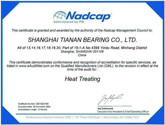值得关注的是,就在日前,上海天安轴承有限公司顺利取得由三方独立审查协会PRI(质量评审协会)颁发的“航空航天和国防合同方授信项目”(Nadcap)热处理证书。Nadcap是专门对航空航天工业的特殊过程进行认证的体系,以AS9100D航空航天质量管理体系为基础,重点关注产品特殊过程全流程的符合性,是国际上在特殊过程方面最全面、最深入的技术性审核。本次顺利通过Nadcap认证,不仅是公司热处理标准化发展的重要里程碑,也标志着公司热处理特殊过程获得了世界先进技术体系的认可。